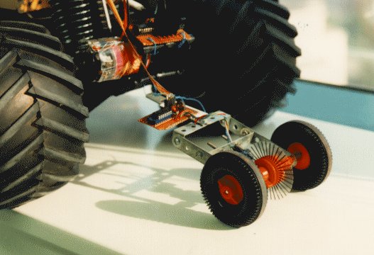 The vehicle, developed by Dinis Fernandes, Pedro Brito and Luis Farrolas, was initially designed to compete in the 1995 Festival des Sciences et Technologies, held annually at La Ferté Bernard, France. Nevertheless, its main objective is to be a prototype intended for research in development of intelligent vehicles and for use in the service sector. |